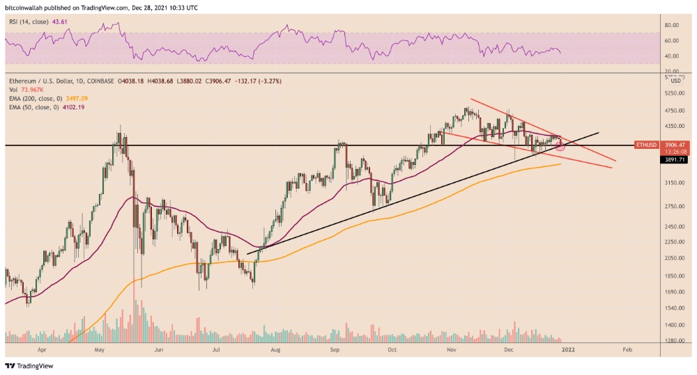 28일 ETH/USD는 3.27% 이상 하락해 3880달러로 장중 최저치를 기록했다. 이번 하락은 이더리움이 12월 23일 하락 추세선을 저항으로 테스트한 후 시작된 광범위한 조정의 일환으로 나왔다.