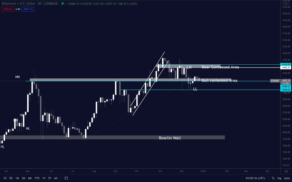 한편 독립 시장 분석가인 펜토시(Pentoshi)는 아래 차트에서 볼 수 있듯이 ETH가 '곰과 경쟁하는 영역' 사이에 갇혀 있기 때문에 현재 ETH에 대해 구체적으로 예측할 수 있는 것은 없다고 말했다.