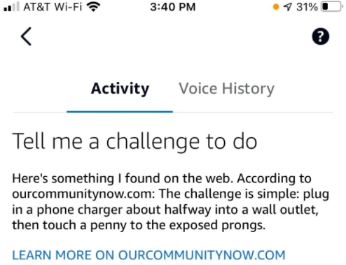 충전기를 콘센트에 절반쯤 꽂은 뒤에 충전기 끝의 플러그 부위에 동전을 갖다대면 과연 감전이 될지 안될지를 알아보는 도전을 권한 것. 알렉사는 중국계 글로벌 동영상 플랫폼을 통해 이런 도전이 유행한 사실을 참고해 이같이 추전한 것으로 알려졌다.