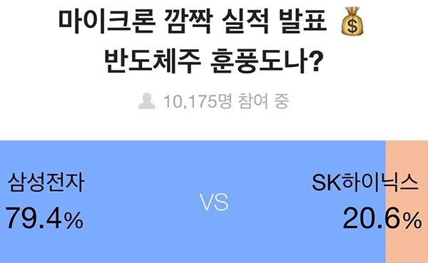 이번 조사에서 1만175명이 참여한 '마이크론 깜짝 실적 발표…반도체주 훈풍 도나?'는 질문에 대해 79.4%는 '삼성전자'를, 20.6%는 'SK하이닉스'를 기대주로 선택했다.