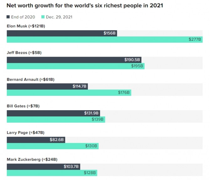 미국 경제매체 CNBC는 글로벌 억만장자들의 순자산을 추적하는 블룸버그 억만장자지수를 토대로 지난 한해 세계 최상위 부호 10명의 순자산이 전년 대비 약 4000억달러(약 475조원)나 늘었다고 30일(이하 현지시간) 보도했다.