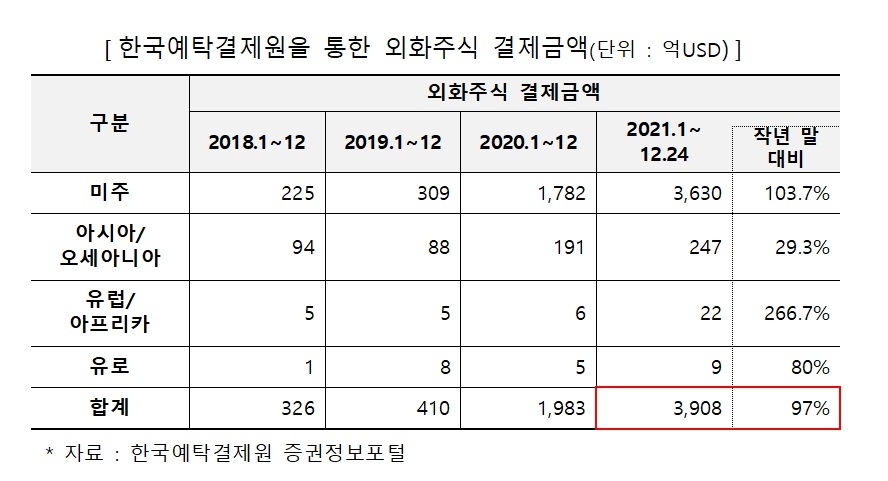 해외주식 결제 3908억달러…전년 比 97%↑