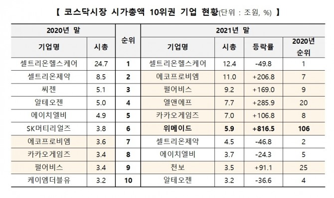코스닥은 기존 바이오 업종 중심 구조에서 탈피해 배터리, 게임 등 성장업종의 종목들이 시총 상위에 고루 포진했다. 2차전지·게임주가 시총 5위 내 자리를 대부분 차지했다. NFT(대체 불가능한 토큰) 대장주 위메이드는 816.5%의 상승률을 기록하며 시총 10위권에 진입했다. 코로나19 확산으로 비대면이 일상화된 가운데 메타버스·NFT가 신성장 동력으로 떠오르면서 개인투자자 매수세가 대거 몰려 관련주의 주가 상승률이 상위권을 차지했다.