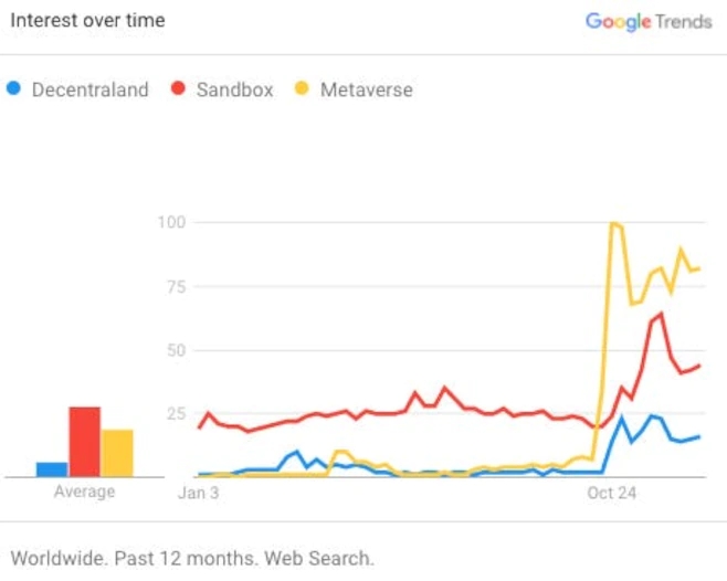 엑시 인피니티, 디센트럴랜드, 샌드박스와 같은 NFT 기반 세계의 속성은 특히 인기가 있다. 이러한 프로젝트의 해당 암호화폐 가격도 치솟았으며, 디센트럴랜드의 MANA 토큰은 지난해 4258% 상승했다. 구글 검색 결과에 따르면 이러한 용어에 대한 검색량이 단시간에 급증했으며 최근 몇 달 동안에만 대중의 관심이 촉발됐다.