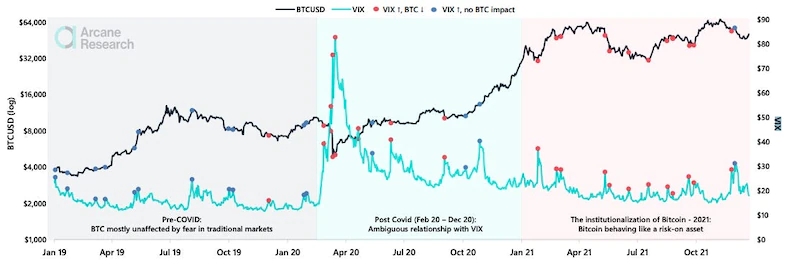 CBOE의 변동성 지수(VIX)의 급등은 비트코인 매도세를 동반했다. 아케인 리서치는 2022년 시장 역풍이 비트코인의 단기 가격 궤적에 영향을 미칠 수 있다고 경고했다.