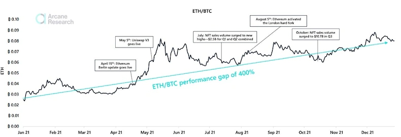 이더리움(ETH)은 오랫동안 제2의 피들(fiddle, 중세 바이올린 이름, 단역을 맡다는 뜻)로 여겨져 비트코인의 하위 코인 취급을 받았다. 그러나 2021년 비트코인이 66% 증가한 반면 이더리움은 418%가 증가하며 비트코인을 크게 앞질렀다.
