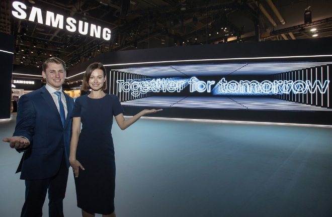 삼성전자는 이번 전시기간 동안 라스베이거스 컨벤션 센터(LVCC)에 참가업체 중 가장 넓은 3596㎡(약 1088평) 규모로 전시관을 마련하고, 16m와 8m에 달하는 2개의 LED(발광다이오드) 사이니지 월을 이용해 ‘쇼윈도(Show Window)’ 콘셉트의 미디어 월을 선보였다.