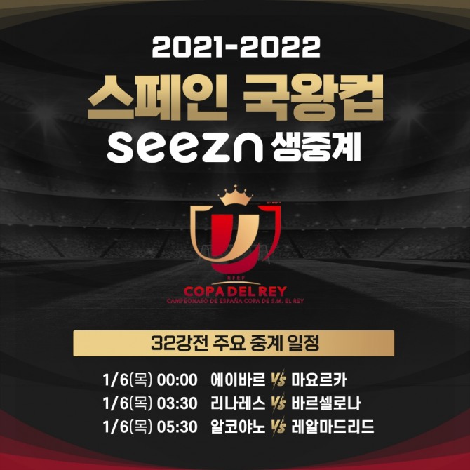 시즌은 32강전부터 결승전까지 스페인 국왕컵의 주요 경기를 생중계하며 그 중 6일 자정(한국시간)에는 이강인의 소속팀인 레알 마요르카와 에이바르의 경기를 생중계해 스포츠 팬들의 이목을 집중시킬 것으로 보인다.