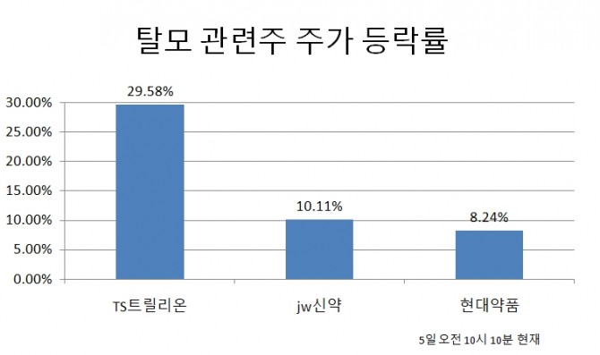 이날 탈모관련주 강세의 배경에는 이 후보의 '소확행(소소하지만 확실한 행복) 공약'에 탈모 치료제도 포함될 수 있다는 소식이 전해졌기 때문으로 풀이된다.