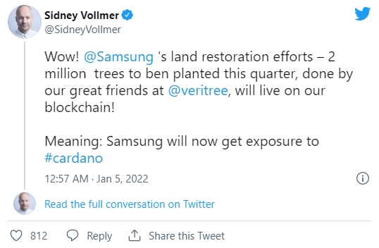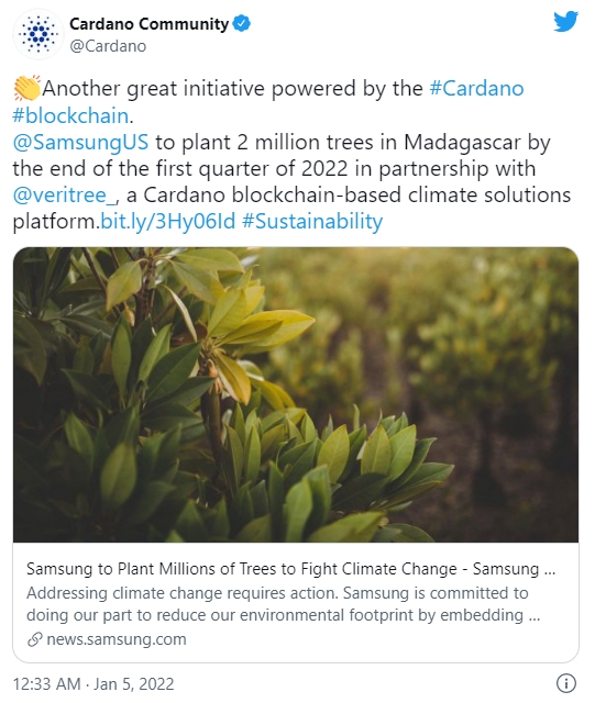 카르다노 재단의 시드니 볼머(Sidney Vollmer)가 게시한 트윗에 따르면 한국 거대 기업 삼성의 미국 법인은 동아프리카에 위치한 섬나라 마다가스카르에 200만 그루의 맹그로브 나무를 심어 기후 변화에 대처하는 것을 목표로 한다.