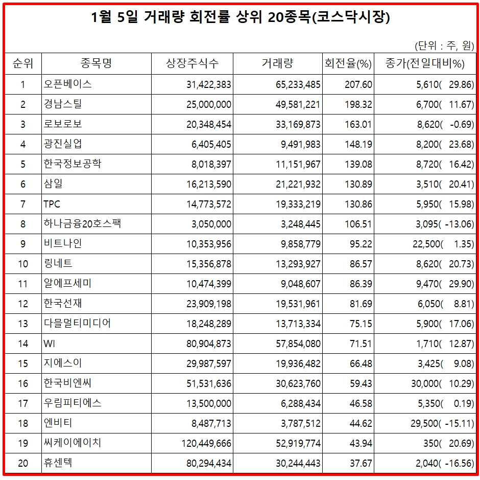 5일 주식시장에서 코스닥 종목 거래량 회전률 기준 상위 종목은 다음과 같다.