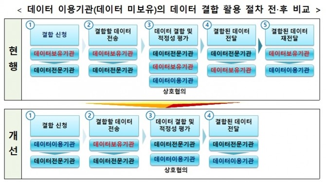 그러나 데이터 이용 기관도 결합 신청을 할 수 있도록 허용됨에 따라 데이터 결합 절차 중 데이터 보유기관은 결합할 데이터를 가명 처리해 데이터전문기관에 전송하는 업무만 담당하고, 이외 절차는 데이터 이용 기관이 수행할 수 있게 된다.