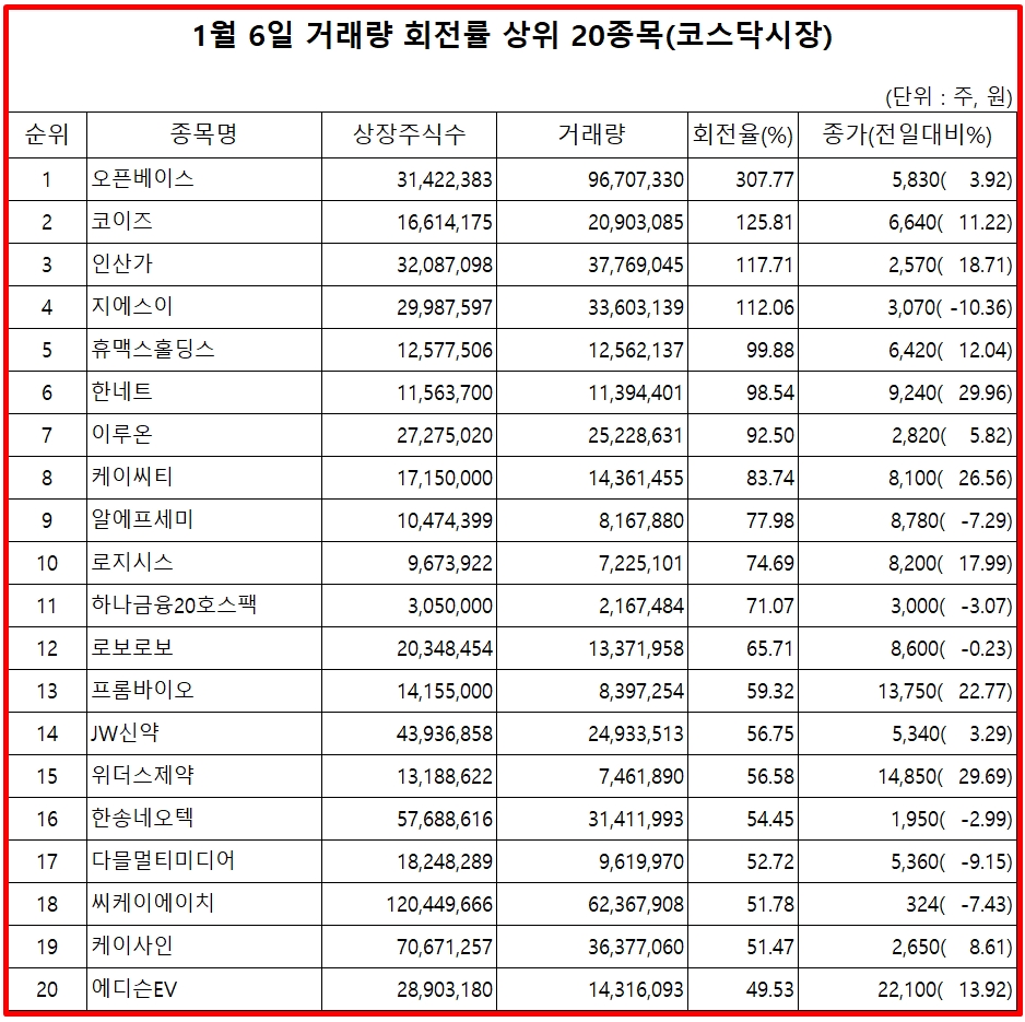 6일 코스닥시장에서 거래량 회전률 기준 상위 종목은 다음과 같다.