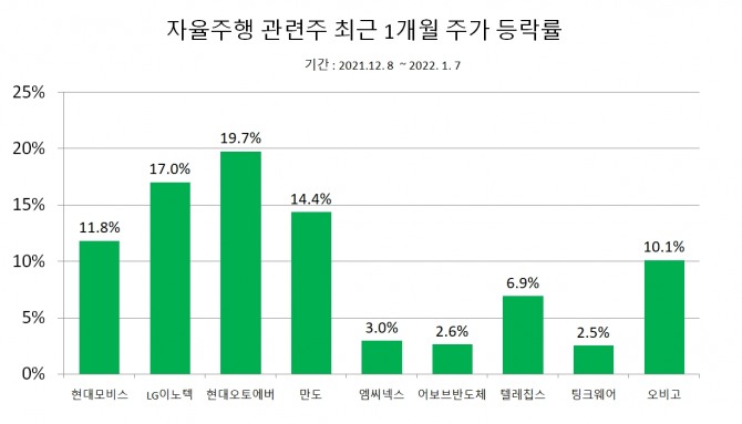 11일 한국거래소에 따르면 지난달 8일부터 이달 7일까지 최근 한 달 동안 주요 자율주행 관련주는 일제히 상승한 것으로 나타났다. 증권가에서도 자동차 업종을 유망 업종으로 꼽을 정도로 우호적이다.
