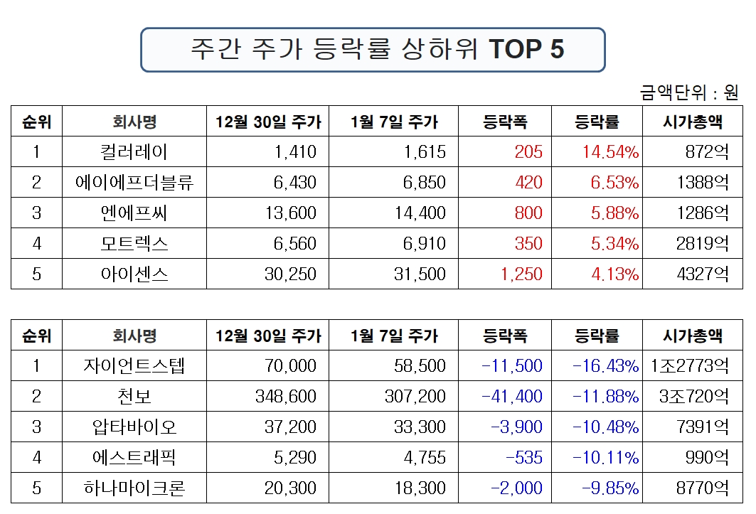표기순서는 순위, 종목명, 7일 주가, 주간 등락폭, 주간 등락률 순이다.