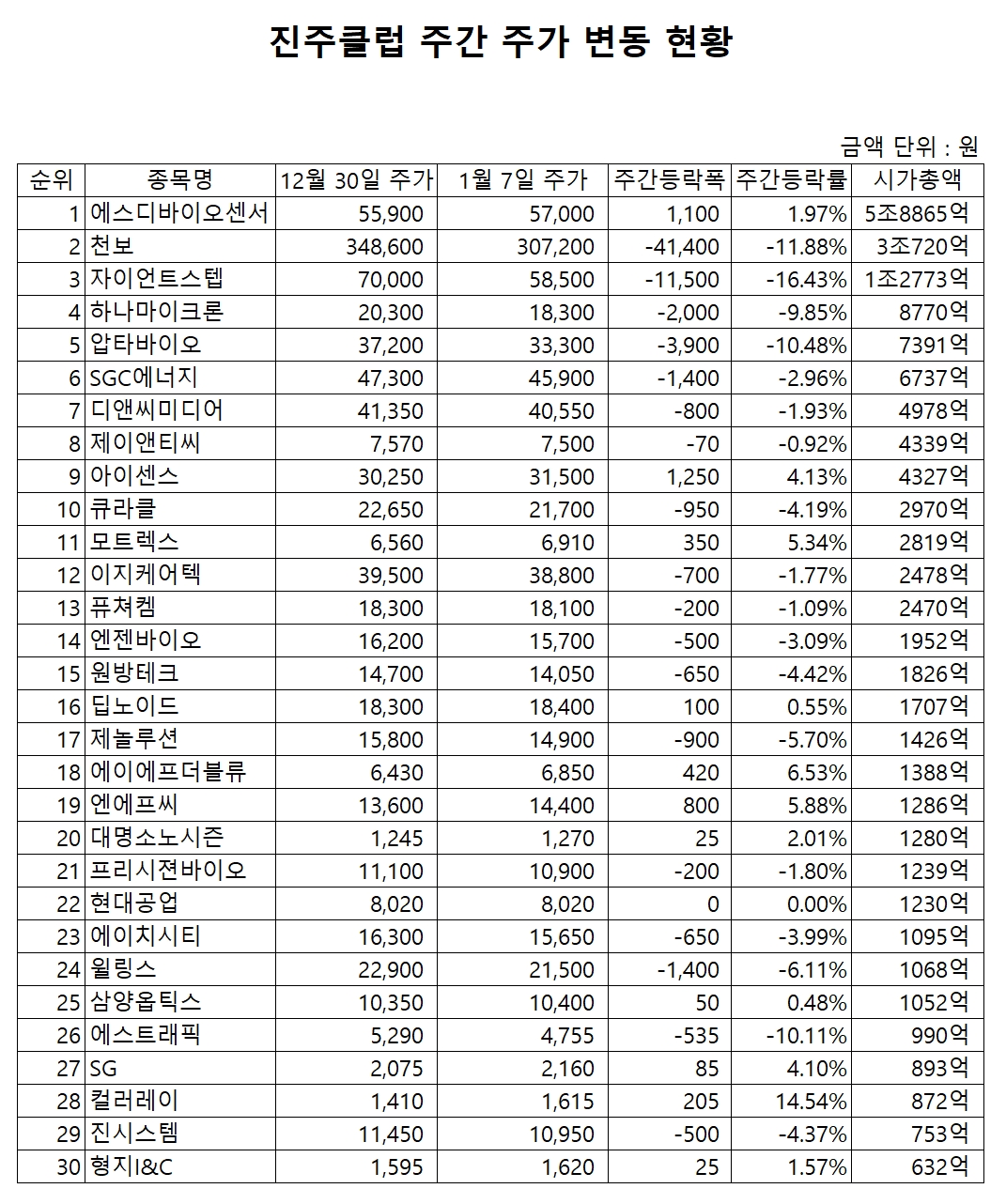 이미지 확대보기'진주클럽' 구성종목의 지난 한주간 주가 상승률 상위 종목은 다음과 같다.
