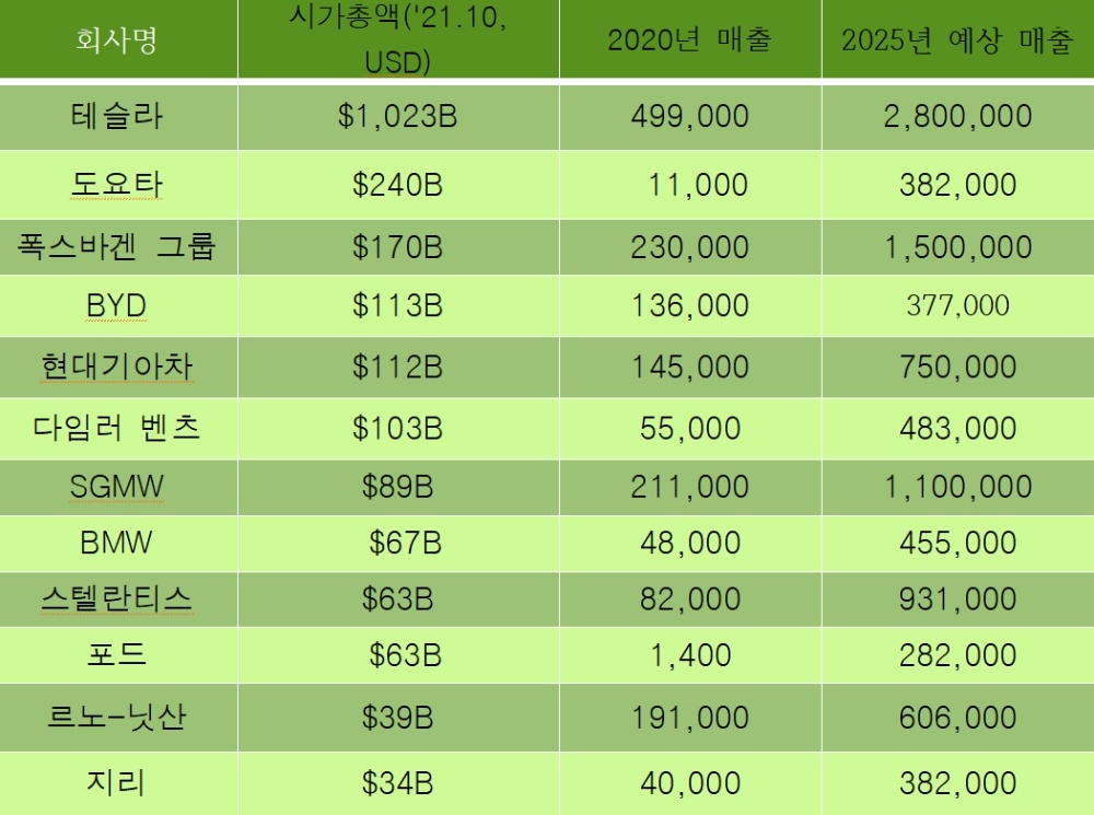 현대기아차는 2021년 10월 기준 시가 총액은 글로벌 5위를 차지한 데 이어 2025년 EV 매출액도 75만대로 테슬라, 폭스바겐, 중국의 SGMW, 스텔란티스에 이어 세계 5위를 차지할 것으로 전망된다.