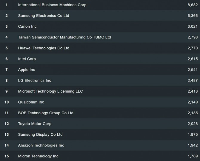 IBM이 지난해 특허 8682건으로 전년도보다 5%감소했으나 1위를 지켰고, 한국의 삼성전자는 6366건으로 전년도보다 1% 감소했다. 일본의 캐논, 대만의 TSMC와 중국의 화웨이테크놀로지스가 톱5를 차지했다. 톱3는 순위 변화가 없으나 TSMC는 2계단 올랐고 화웨이는 4계단 상승했다.