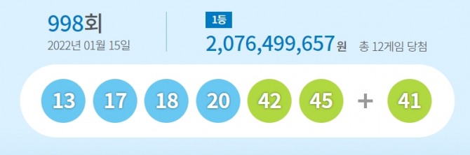 이미지 확대보기이번 회차에서 당첨번호 6개를 모두 맞춘 1등 당첨자는 12명으로 각각 20억7649만 원씩 받는다.