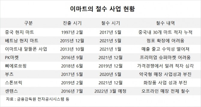 이밖에 이마트가 지난 2018년 8월 선보인 남성 패션 전문 편집숍인 쇼앤텔도 2020년 사업을 접었고 같은해인 2018년 오픈한 가정간편식 전문점인 PK피코크도 경영난을 이유로 2020년 철수했습니다.