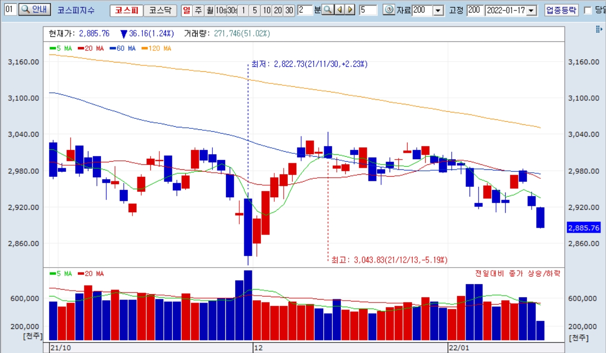 코스피가 장중 2900선 아래로 내려간 건 지난해 12월 2일 장중 저점 2,874.64를 찍은 후 처음이다.