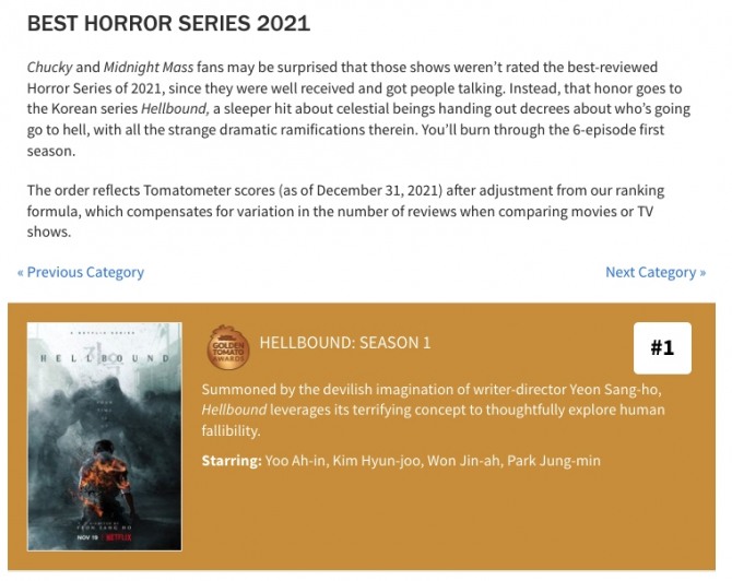 이미지 확대보기17일 넷플릭스에 따르면 '지옥'은 미국 영화평점 사이트인 로튼토마토가 선정한 '2021 골든 토마토 베스트 호러 시리즈 부문'에서 1위를 차지했다.