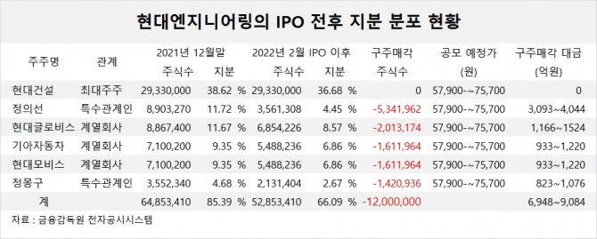 정의선 회장의 구주 매각 주식수는 공모시 신주 모집 400만주에 비해 134만1962주 많은 것으로 2대주주인 정 회장이 현대엔지니어링 IPO를 이용해 주식을 팔게 된다는 지적이 나오는 대목입니다.