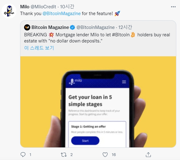 부동산 핀테크 기업 마일로(Milo)가 미국에서 최초로 비트코인 모기지를 출시했다.