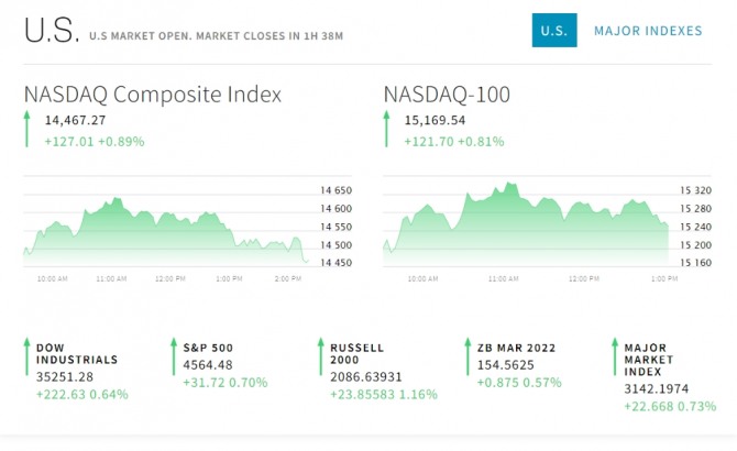 이미지 확대보기21일 뉴욕증시에 따르면 미국의 고용 지표가 부진했다. 이는 FOMC 긴축의 속도를 다노 늦추는 요인으로 작용할 수 있다. 이러한 전망에 뉴욕 증권거래소(NYSE)에서 다우존스30산업평균지수와 스탠더드앤드푸어스(S&P)500지수 그리고 기술주 중심의 나스닥 지수 모두 오르고 있다. 특히 나스닥 기술주의 상승폭이 크다. 비트코인도 큰 폭으로 오르고 있다. 암호화폐에 모처럼 랠리가 왔다.