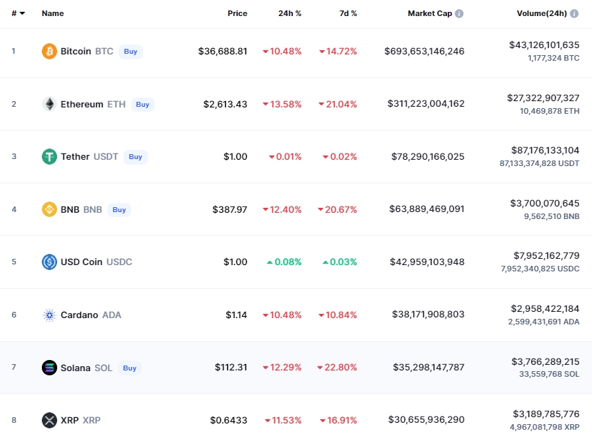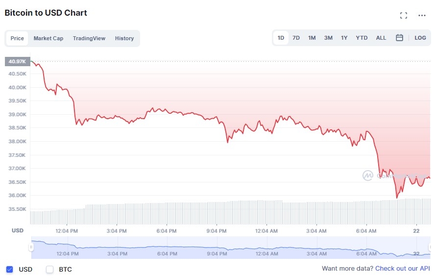 이미지 확대보기22일 오전 9시 50분 현재 글로벌 암호화폐 시세사이트 코인마켓캡에서 비트코인(BTC)는 전일대비 10.48% 폭락해 3만6688.81달러에 거래됐다. 시가총액은 6936억달러로 하루동안 약 900억달러가 증발했다.