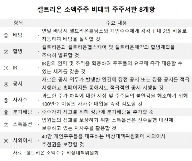 소액주주 비대위가 제안한 8개항은 △셀트리온홀딩스와 개인주주에 1 대 2의 비율로 차등배당 실시 △조속한 합병계획 발표 △IR팀의 인력 및 조직 확충 △공시 적극화 △100만주 이상 자사주 매입 △정관에 분기배당 추가 △스톡옵션 개선 △비상대책위원회에 사외이사 추천권 등으로 되어 있습니다.
