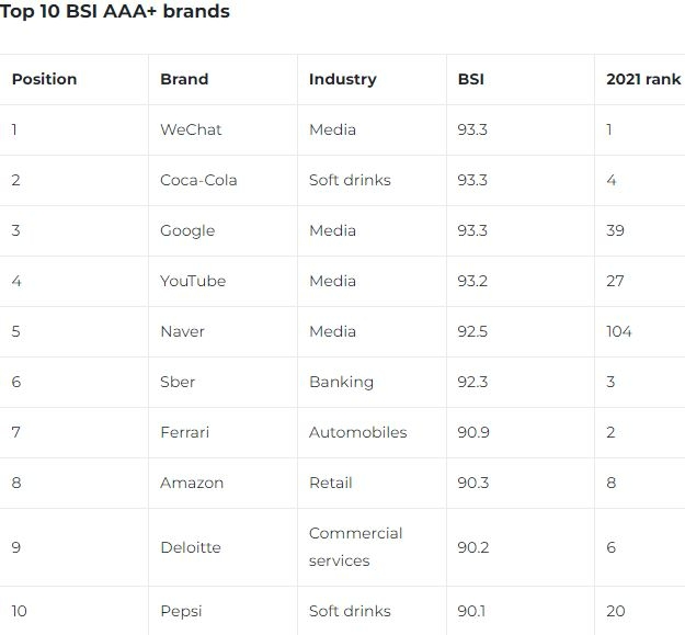 2위는 음료 브랜드 코카콜라로 지난해 4위에서 상승했다. 경쟁 브랜드인 펩시는 20위에서 10위로 올라섰다. 유럽은행 SBer뱅크가 3위에서 6위로 내려갔고, 자동차 페라리는 2위에서 7위로 하락했다. 전자상거래 업체인 아마존은 2년째 8위를 지켰고 컨설팅 업체 딜로이트는 3계단 하락한 9위에 랭크됐다.