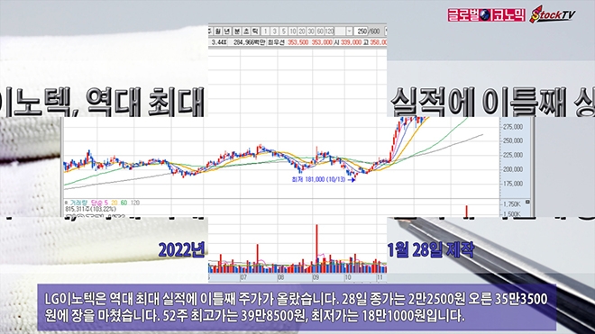 LG이노텍은 역대 최대 실적에 이틀째 주가가 올랐습니다. 28일 종가는 2만2500원 오른 35만3500원에 장을 마쳤습니다. 52주 최고가는 39만8500원, 최저가는 18만1000원입니다.