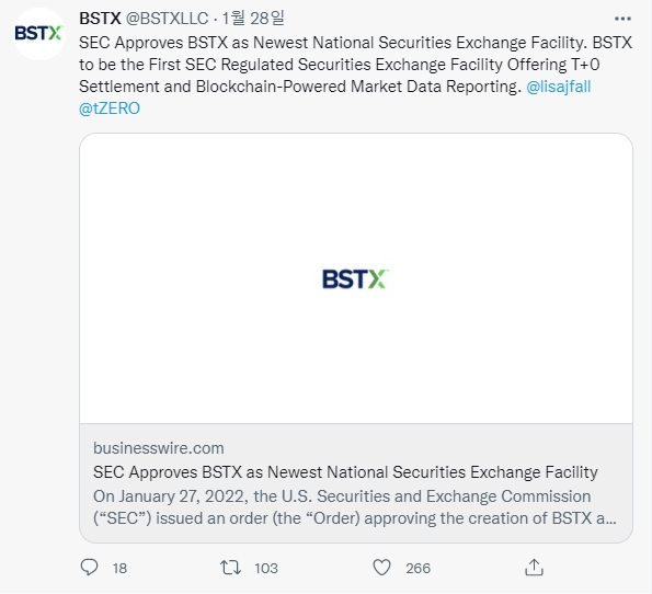 BSTX는 BOX와 오버스톡(Overstock)의 블록체인 부문 tZERO가 공동으로 론칭했으며, 당초 상장된 등록 보안 토큰 출시 승인을 구했다. 다만 이번 SEC의 국가증권거래소 운영 승인은BSTX가 블록체인 기술을 활용해 전통시장에서 보다 빠른 결제를 할 수 있도록 했다. SEC는 ”위원회는 [BSTX] 거래소의 현재 제안이 디지털 토큰의 거래 및 그러한 제안이나 다른 블록체인 기술의 추가적인 사용을 포함하지 않는다는 점에 주목하고 있다”고 밝혔다.