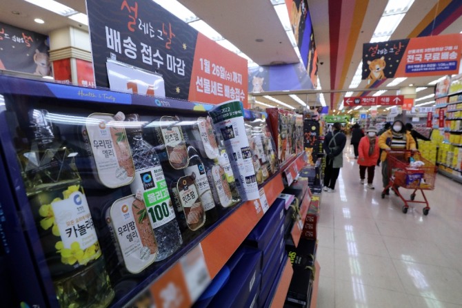 GS슈퍼마켓의 경우 다음달 2일까지 10만원 이상 행사 대상 설 선물 세트를 구입하면 최대 100만원 까지 결제금액 구간별로 상품권이 제공된다.