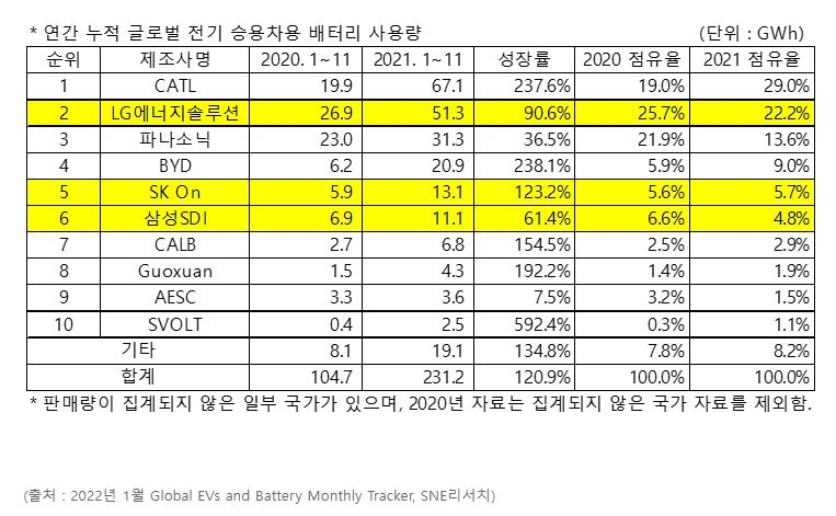 SNE리서치는 이와 관련 "CATL과 BYD 등 중국계 배터리 업체들은 꾸준한 자국 시장 성장세에 힘입어 글로벌 점유율이 상승한 반면 파나소닉 등 일본계 업체들은 시장 평균을 밑도는 성장률로 점유율이 하락했다"고 분석했다.