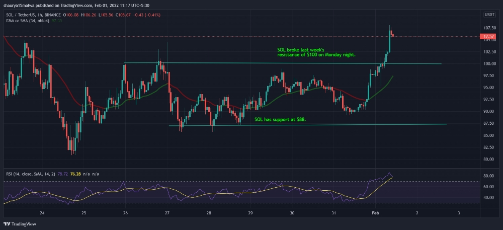 이미지 확대보기아시아 외환시장에서 SOL 가격은 31일 오전 90달러에서 1일 오전 106달러 이상으로 급등했다. SOL은 2022년 1월 초 175달러 선에 거래됐으나 시장 하락세가 확대되면서 지난주 82달러 수준까지 떨어졌다.