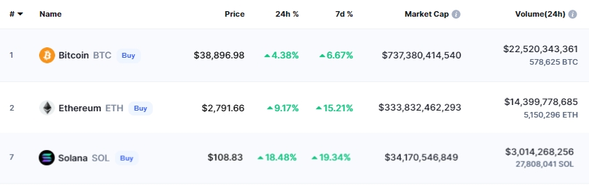 이미지 확대보기한편, 1일 밤 11시 05분 현재 코인마켓캡에서 솔라나의 SOL코인은 24시간 전 대비 18.48% 급등해 108.83달러에 거래됐다. 시가총액은 341억 달러로 7위다.
