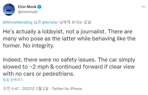 2일 전기차 전문매체 일렉트렉에 따르면 머스크 CEO는 이날 올린 트윗에서 이번 리콜 소식을 타전한 매체 가운데 하나인 AP통신의 톰 크리셔 기자를 겨냥해 “이번 리콜은 안전 문제와는 전혀 무관한 조치”라면서 “(안전 문제와 관련이 있는 것처럼 기사를 쓴) 크리셔는 기자의 탈을 쓴 로비스트”라고 주장했다.