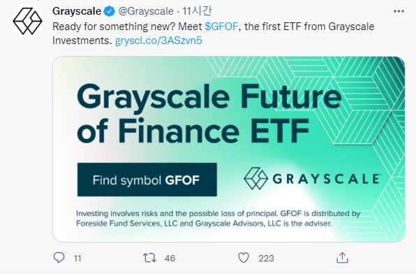 그레이스케일은 2일 '그레이스케일 선물 파이낸스 ETF(Grayscale Future of Finance ETF)'를 출시한다고 발표했다. 이 ETF는 암호화폐에 깊이 관여하는 22개의 상장 기업으로 구성된 주식 바구니를 보유할 예정이다. 이들 기업에는 페이팔(PayPal), 블록(Block, 과거 스퀘어-Square)과 같은 지불 및 기술 회사와 암호화폐 거래소 코인베이스, 실버게이트 캐피털( Silvergate Capital)과 같은 투자회사가 포함된다.