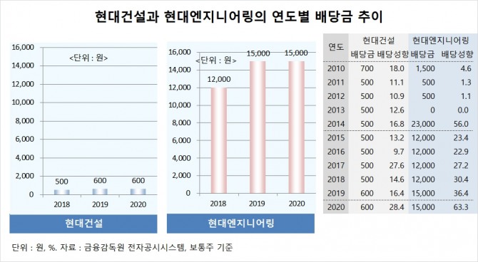 현대엔지니어링, 2014년 현대엠코 합병 후 배당금 대폭 상향…2020년 현대엔지니어링 주당 배당금은 현대건설의 25배, 현대차 오너가에 유리한 배당정책 지적도