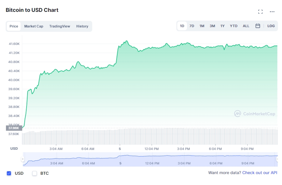 5일 오후 11시 17분 현재 글로벌 암호화폐 집계 사이트 코인마켓캡에서 비트코인(BTC)은 24시간 전 대비 10.27% 급등해 4만1450.60달러에 거래됐다. 시가총액은 7855억달러가 됐다.