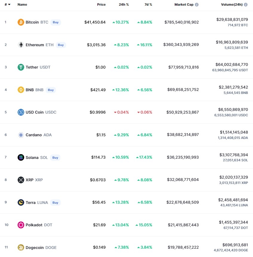 5일 오후 11시 17분 현재 코인마켓캡에서 카르다노의 에이다 토큰은 9.29% 상승해 1.15달러에 거래됐다. 그밖에 솔라나(SOL)는 10.59% 급등해 114.73달러가 됐다. 리플(XRP)은 9.78% 급등해 0.6703달러, 폴카닷(DOT)은 13.04% 폭등해 21.69달러, 도지코인(DOGE)은 7.38% 급등해 0.149달러에 거래됐다.