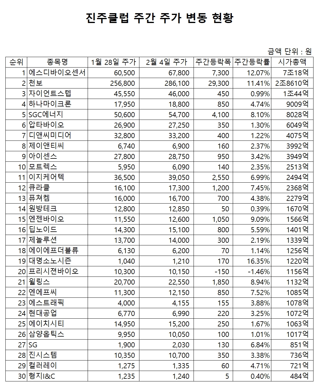 30개사로 구성된 '진주클럽'의 전체 시가총액은 한주간 1조3209억원(8.3%) 증가해 지난 4일 기준 17조2277억원을 기록했다.