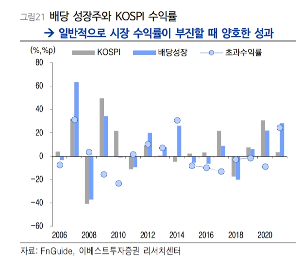 정다운 이베스트투자증권 연구원은 "올해는 배당성장 (투자)콘셉트가 긍정적일 것으로 전망한다"며 "이와 같은 종목 유형은 코스피 수익률이 부진하거나 이익 증가가 부진할 때 우수한 성과를 보이는 경향이 있다"고 설명했다.