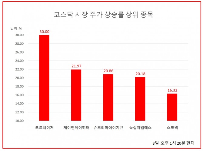 한편, 코드네이처 이외에도 제이엔케이히터와 슈프리마에이치큐, 녹십자엠에스 이 20% 넘는 상승률을 기록하며 상승률 상위권에 이름을 올렸다.