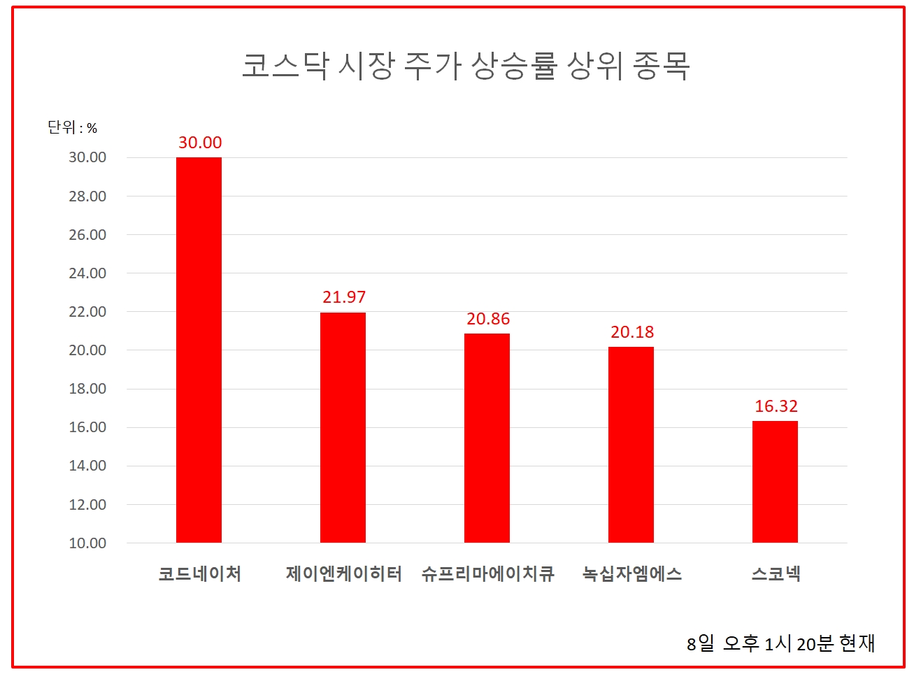 8일 오후 1시 20분 현재 코스닥시장 주가상승률 상위 30개 종목은 다음과 같다.