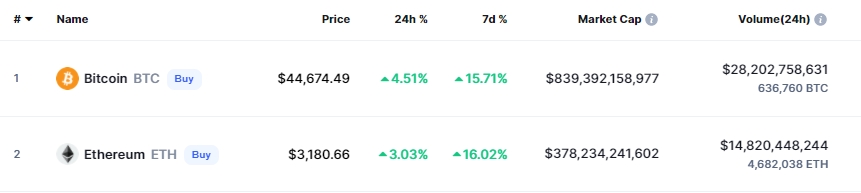 코인 메트릭스(Coin Metrics)에 따르면 비트코인은 6% 급등해 1월 5일 이후 최고 수준인 4만4500달러까지 올랐다. 동부 표준시 기준 7일 오후 4시 2분 현재 비트코인은 4만4068.88달러에 거래됐다.