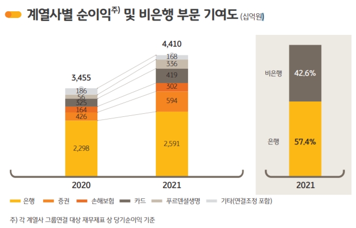 KB금융그룹 관계자는 “2021년에는 견조한 여신성장과 국내외 M&A 영향으로 이자이익이 큰 폭으로 증가했다”며 “그룹의 수익기반을 다변화하고 주요 계열사들의 핵심 비즈니스 경쟁력을 제고한 결과 그룹의 순이익에서 비은행 부문이 차지하는 비중도 42.6% 수준으로 확대됐다”고 진단했다.