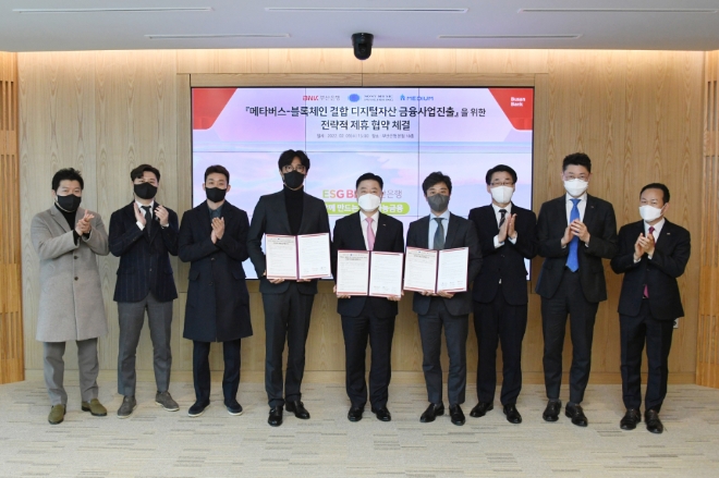 이미지 확대보기9일 부산은행은 부산 남구 소재 본점에서 소니뮤직퍼블리싱(한국지사), 미디움 등과 디지털자산의 금융사업 진출을 위한 '메타버스-블록체인 전략적 제휴' 협약식을 가졌다고 밝혔다.
